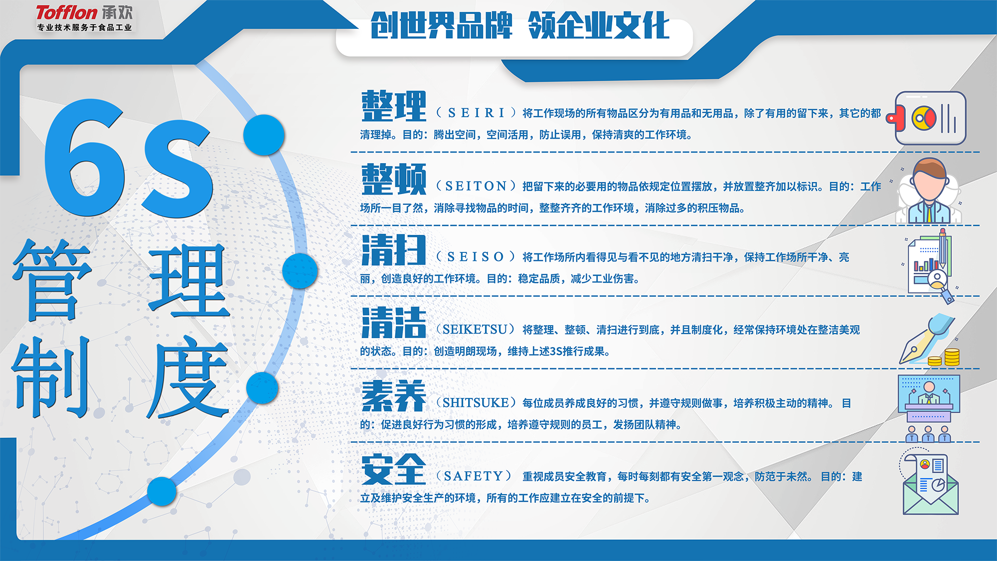6S管理是5S的升級,6S即整理(SEIRI)、整頓(SEITON)、清掃(SEISO)、清潔(SEIKETSU)、素養(yǎng)(SHITSUKE)、安全(SAFETY)。為確保車間正常生產(chǎn)秩序,保證各項生產(chǎn)順利進行,持續(xù)營造良好的工作環(huán)境,公司推行生產(chǎn)車間6S管理制度。結(jié)合車間實際情況,設置了參觀路線,車間分區(qū)域劃線,針對加工設備及工作臺、工具箱、物品擺放,管理看板、清掃用具等制定了相應的管理標準,并進行不定期的衛(wèi)生檢查。