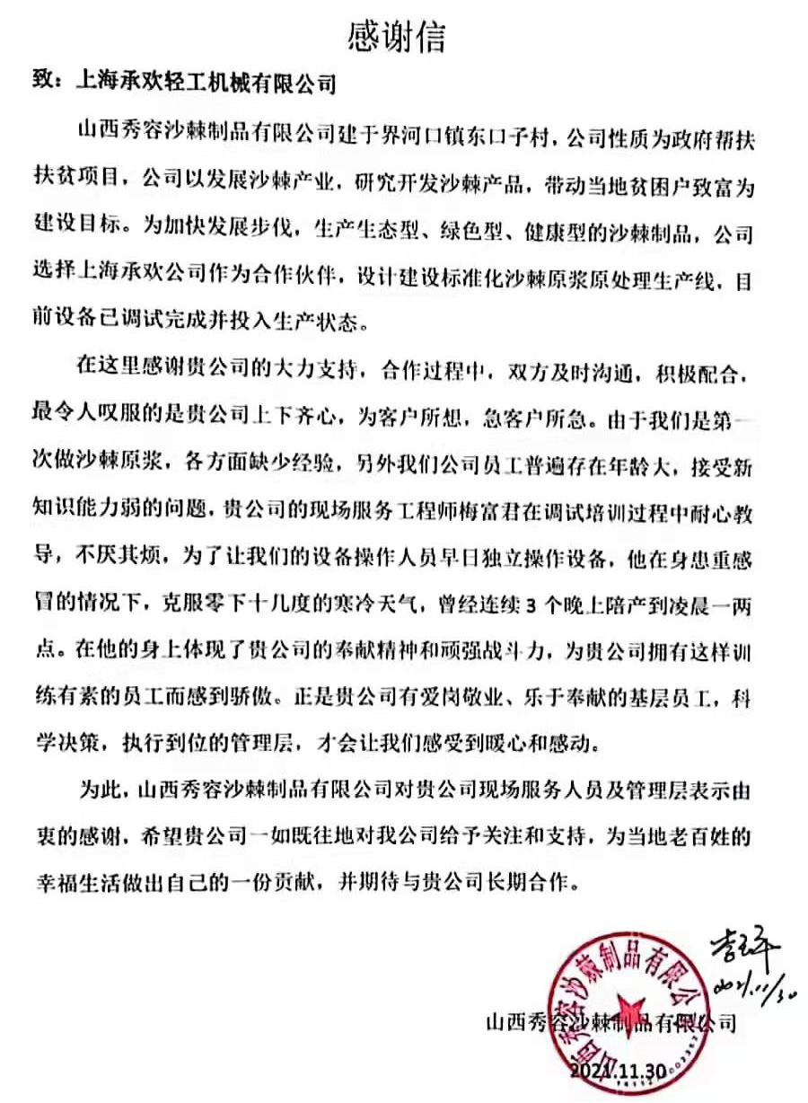 近日,我司收到山西秀容沙棘制品有限公司發(fā)來的感謝信。信中高度贊揚了我司現(xiàn)場服務工程師梅富君專業(yè)務實、勤奮敬業(yè)的服務精神,并對項目實施團隊及管理層的支持及協(xié)助表示感謝。