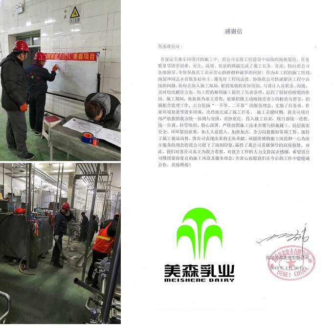 近日,東富龍食品工程事業(yè)部收到了一封來自保定美森乳業(yè)的感謝信,信中對現場人員面臨場地緊張,任務繁重,環(huán)境復雜等困難,安全、高效、優(yōu)質的圓滿完成施工任務,表示了衷心的感謝,并對東富龍承歡頑強拼搏的施工風范和服務理念,進行了高度稱贊!一封感謝信,簡單幾百字,卻飽含美森乳業(yè)對我們的濃濃感激之情,更是對東富龍承歡長期以來不斷提升服務品質的回饋和認可!