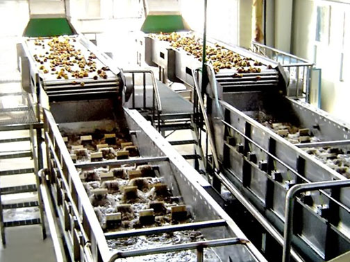 水果經(jīng)由前道揀果工序送入自動(dòng)撥板浮洗機(jī),通過旋轉(zhuǎn)推進(jìn)軸上的撥板不停的轉(zhuǎn)動(dòng),將水果按照循環(huán)水流方向運(yùn)動(dòng)并加快旋轉(zhuǎn),在有限的空間內(nèi)增加了水果的運(yùn)動(dòng)路徑,增加水果的清洗時(shí)間,使得水果加快旋轉(zhuǎn),加大水流對(duì)其沖洗力度,增加了水果相互間的柔性對(duì)流,從而得到徹底的清洗效果。