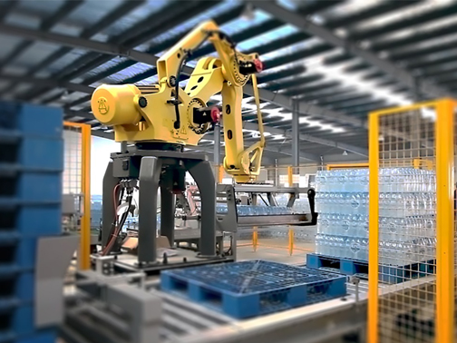 機器人碼垛機可以集成在任何生產(chǎn)線中,為生產(chǎn)現(xiàn)場提供智能化、機器人化、網(wǎng)絡(luò)化,可以實現(xiàn)啤酒、飲料和食品行業(yè)多種多樣作業(yè)的碼垛物流,廣泛應(yīng)用于紙箱、塑料箱、瓶類、袋類、桶裝、膜包產(chǎn)品及灌裝產(chǎn)品等。配套于三合一灌裝線等,對各類瓶罐箱包進行碼垛。